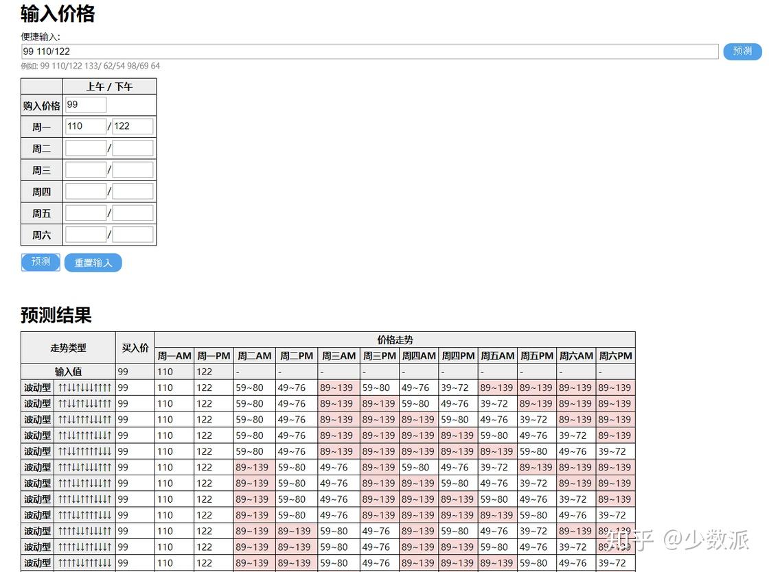 为了能让更多人走上致富路,一个名为 moothumb 的韩国网友利用前作《来吧!动物之森》的价格走势模型,制作了一个预测大头菜价格的工具。把周日的购入价格、周一上午和下午的价格输入进去,就能得到一个属于你的价格走势预测。
