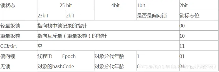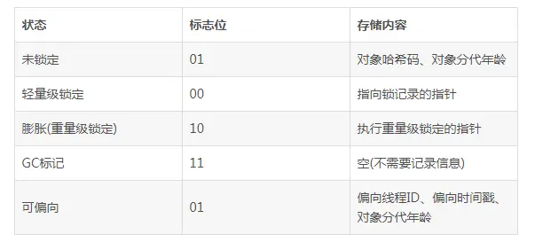 markword数据的长度在32位和64位的虚拟机(未开启压缩指针)中分别为32bit和64bit,它的最后2bit是锁状态标志位,用来标记当前对象的状态,对象的所处的状态,决定了markword存储的内容,如下表所示: