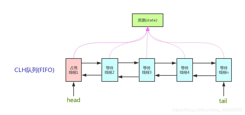 AQS维护了一个volatile int state(代表共享资源)和一个FIFO线程等待队列(多线程争用资源被阻塞时会进入此队列)。state的访问方式有三种: