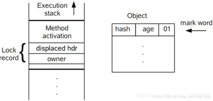 1.在代码进入同步块的时候,如果同步对象锁状态为无锁状态(锁标志位为“01”状态,是否为偏向锁为“0”),虚拟机首先将在当前线程的栈帧中建立一个名为锁记录(Lock Record)的空间,用于存储锁对象目前的Mark Word的拷贝,官方称之为 Displaced Mark Word。这时候线程堆栈与对象头的状态如图:
