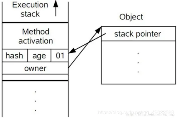 4.如果这个更新动作成功了,那么这个线程就拥有了该对象的锁,并且对象Mark Word的锁标志位设置为“00”,即表示此对象处于轻量级锁定状态,这时候线程堆栈与对象头的状态如图所示。