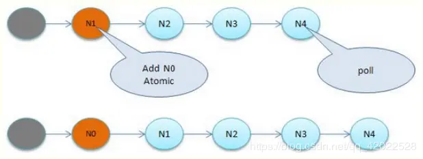 ContentionList并不是真正意义上的一个队列。仅仅是一个虚拟队列,它只有Node以及对应的Next指针构成,并没有Queue的数据结构。每次新加入Node会在队头进行,通过CAS改变第一个节点为新增节点,同时新增阶段的next指向后续节点,而取数据都在队列尾部进行。