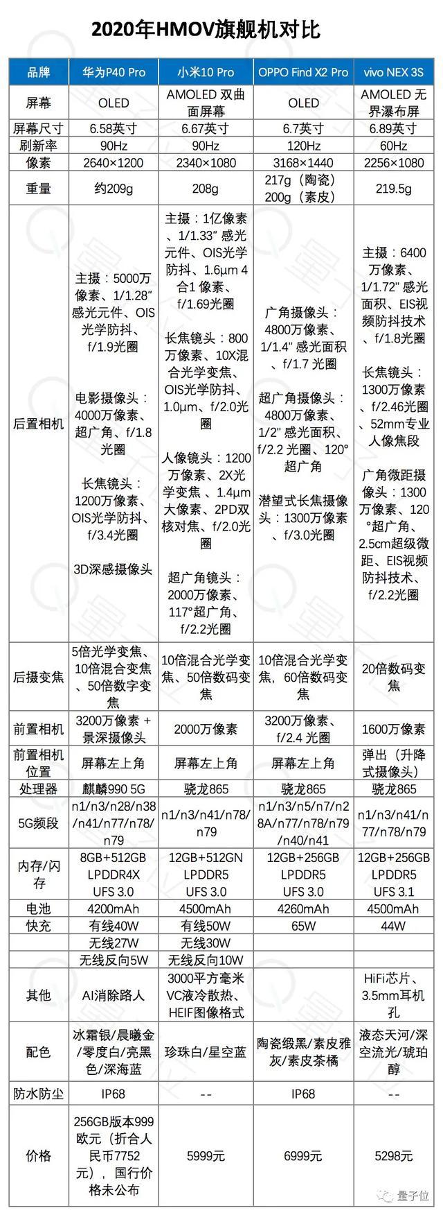 由于是尊贵的旗舰机,当然要上最尊贵的配置,所以除了昂贵的OPPO Find X2 Pro兰博基尼版和暂时没影儿(6月发售)的华为P40 Pro+,以下都是最高配置: