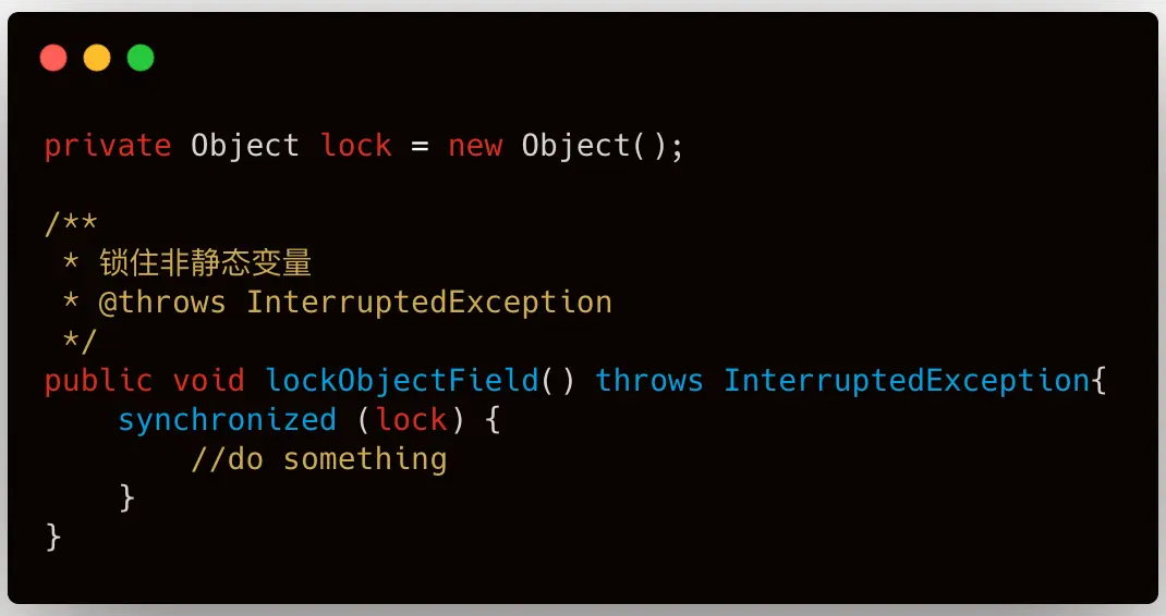 非静态变量是实例自身变量,不会与其他实例共享,所以锁住实体内声明的非静态变量可以实现对象锁。锁住同一个变量的方法块共享同一把锁。