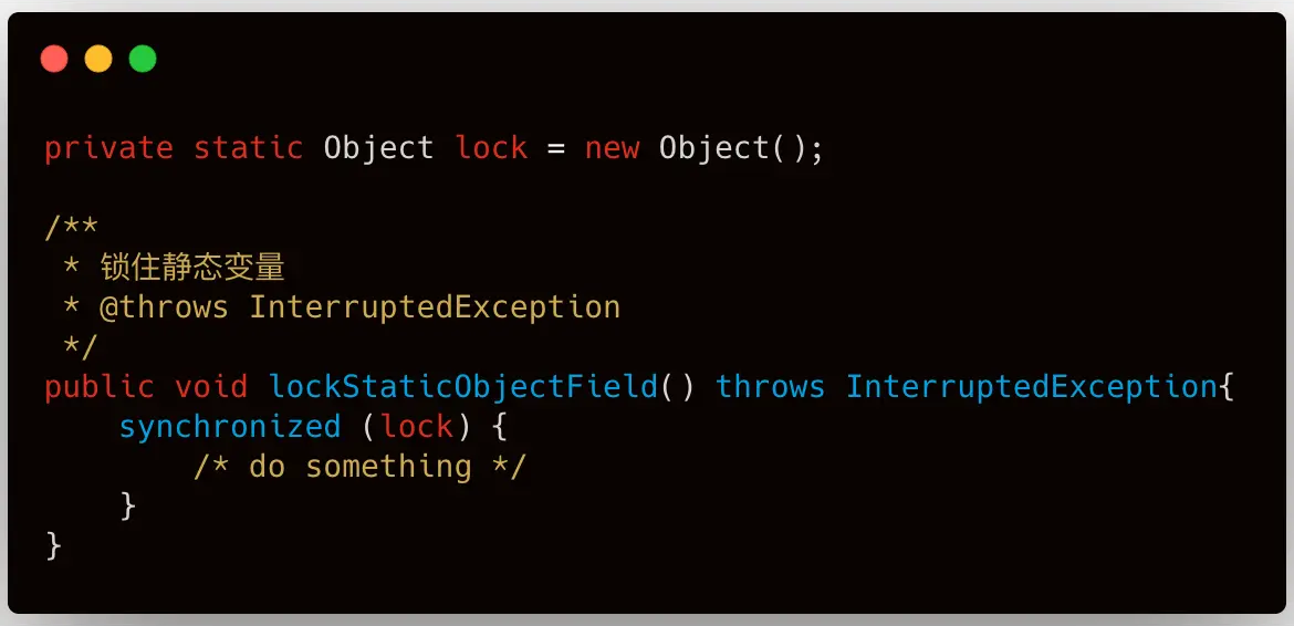 因为静态变量和类信息一样也是存在方法区的并且整个 JVM 只有一份,所以加在静态变量上可以达到类锁的目的。