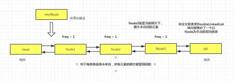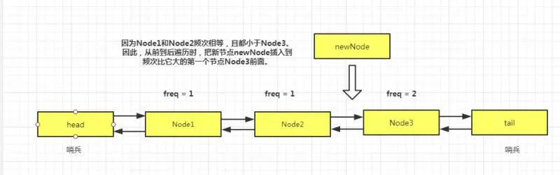 每当有新频次的 DoubleLinkedList 需要添加进来的时候,直接插入到 lastLinkedList 这个哨兵前面,因此 lastLinkedList.pre 就是一个最小频次的内部链表。