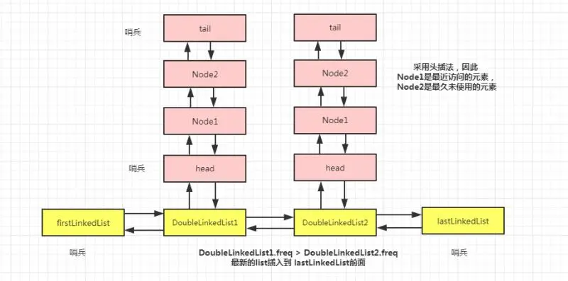 这里,firstLinkedList 和 lastLinkedList 分别代表外层链表的头尾结点。链表中的元素 DoubleLinkedList 有一个字段 freq 记录了频次,并且按照前大后小的顺序组成外层链表,即图中的 DoubleLinkedList1.freq 大于它后面的 DoubleLinkedList2.freq。