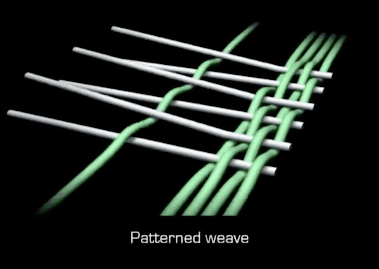 在织机上,经纱在经轴上逐根排列,根据织物纹样的要求,部分经纱被抬起,另一部分经纱则保持不动 形成织口,纬纱从织口中引入,经纱抬起的规律不同以及纱线颜色的排列变化,就会给织物带来不同的纹样: