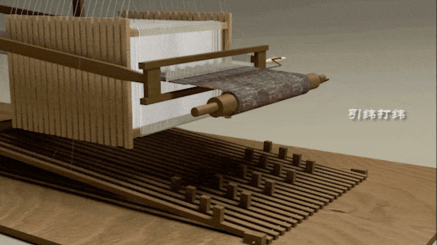 而到了战国时期的 多综式提花织机,则发明了 综框 来完成这项工作,棕框的上下梁间有垂直排列的综丝,经纱穿入综丝中,织物纹样的变化有一个规律,也就意味着经纱是随着纬纱的引入被 有规律的循环提起,将 提起规律相同的经纱 穿入 同一个综框的综丝 中,当综框被提升时,穿入的所有经纱都会被同时提起,每一个综框都有一个脚踏板,踩下脚踏板则可通过机械装置控制其抬升:
