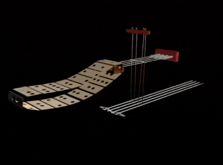简单来说,花本存储了纹样信息。图中花本的竖线连接穿入了经纱的综丝,横线存储了每一次引入纬纱时提花信息,当竖线越过横线覆盖在横线前方时,表明对应的经纱要被提起。