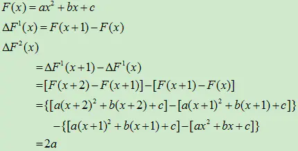 对于二次多项式,每个相邻的 x 所对应的一次差分之差仍然都是一个常数,我们可以导出这一常数的通用公式:
