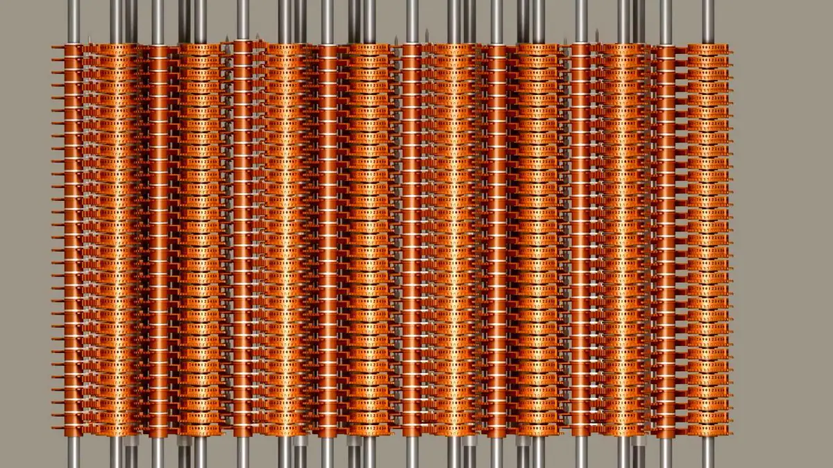 示数装置包含 4 行、10 列共 40 个示数表盘,每个盘面被均匀地分成 100 格,并装有两根指针,和钟表十分相像,“分针” 转一圈可计 100,“时针” 转一圈则计 10000。可见,整个示数装置可以表达很庞大的数据。