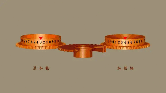 仔细观察可以发现,这两个轮子上的数字排列顺序是相反的。在两轮相加的过程中,左侧轮作为累加轮朝数值增大的方向旋转,而右侧轮作为加数轮则朝数值减少方向旋转。在巴贝奇改进的并行差分算法中,两个步骤交替进行,同一个计数轮需要交替充当累加轮和加数轮的角色,于是当机器运行起来,这些齿轮需要正反方向交替旋转。