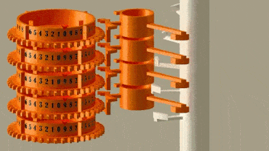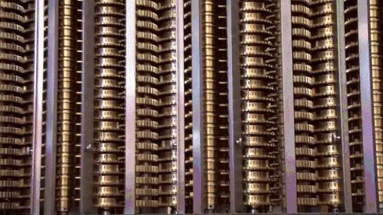 差分机的进位机构比较复杂,简单地说,每个计数轮都有一个针对高位的 “进位提示器”,当计数轮从 9 转到 0,其对应的 “进位提示器” 就被拨到 “需要进位” 的状态,每次计算,计数轮都要转动两次,第一次是每位数相加,第二次是按照“进位提示器”进行进位。我们直观地感受一下连续进位是什么样子: