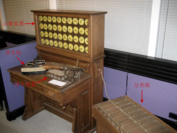 他发明的机器叫 制表机 (tabulator/tabulating machine),顾名思义,就是专门用来制作数据统计表的机器。制表机主要由示数装置、穿孔机、读卡装置和分类箱组成。