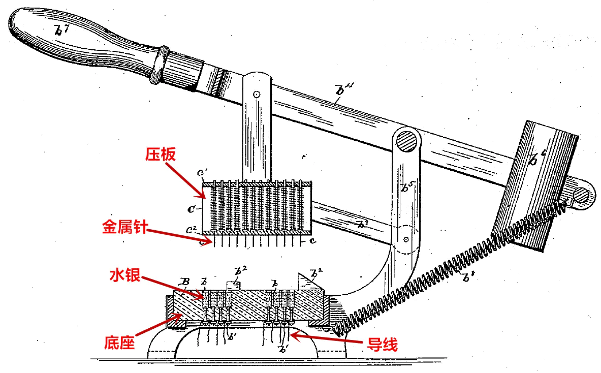 打好了孔,下一步就是将卡片上的信息统计起来。读卡装置的组成如下图所示,其外形和使用方式有点类似现在的重型订书机,将卡片置于压板和底座之间,按压手柄,就完成了对这张卡片的信息读取。