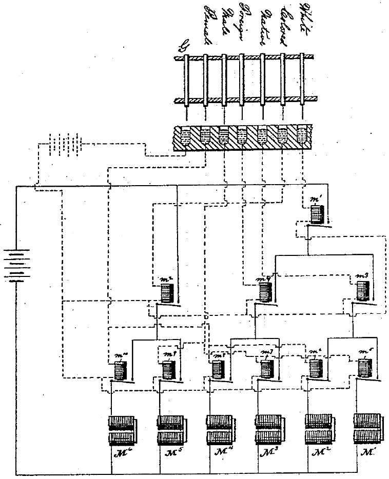 这一基本原理与雅卡尔提花机类似,不难理解。重头戏是,如何将电路通断对应到所需要的统计信息呢?霍尔瑞斯在专利中给出了一个简单的例子,如下图所示。这是涉及性别、国籍和人种 3 项信息的统计电路图,虚线为控制电路,实线为工作电路。