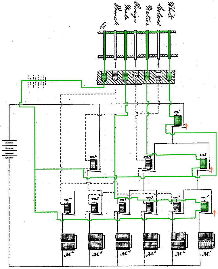 以 M1 为例,如果表示 Native、White 和 Male 的针同时与水银接触,接通的控制电路: