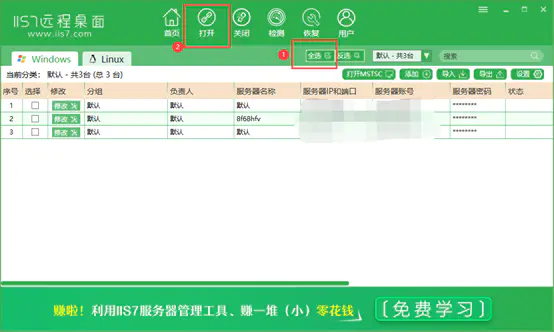 如果您要批量打开多台服务器,点击【全选】之后,再点击【打开远程】即可: