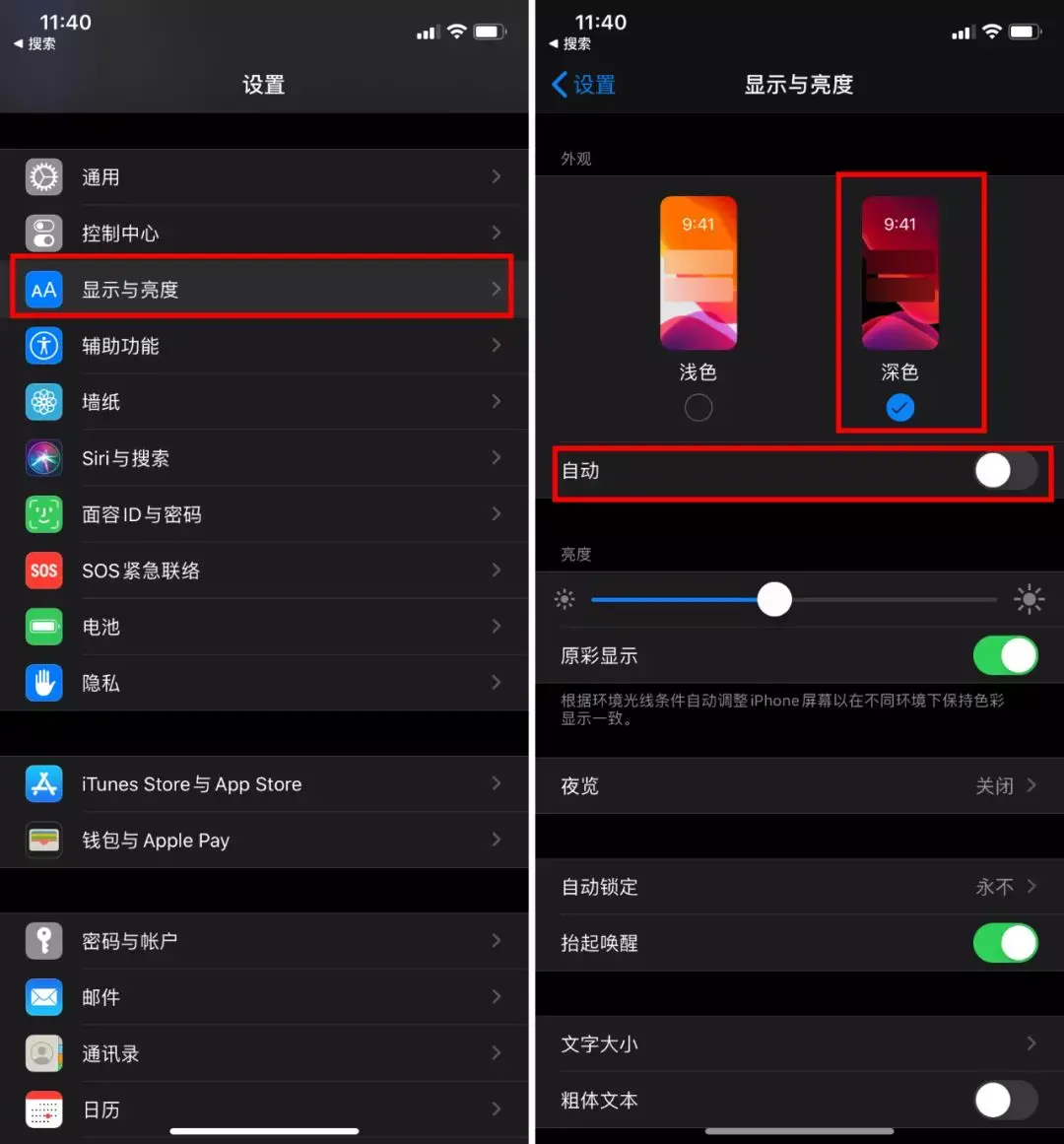 - 打开iPhone“设置”,通过“显示与亮度”,从浅色切换为“深色”即可体验;或调为“自动”,夜间自动适配;