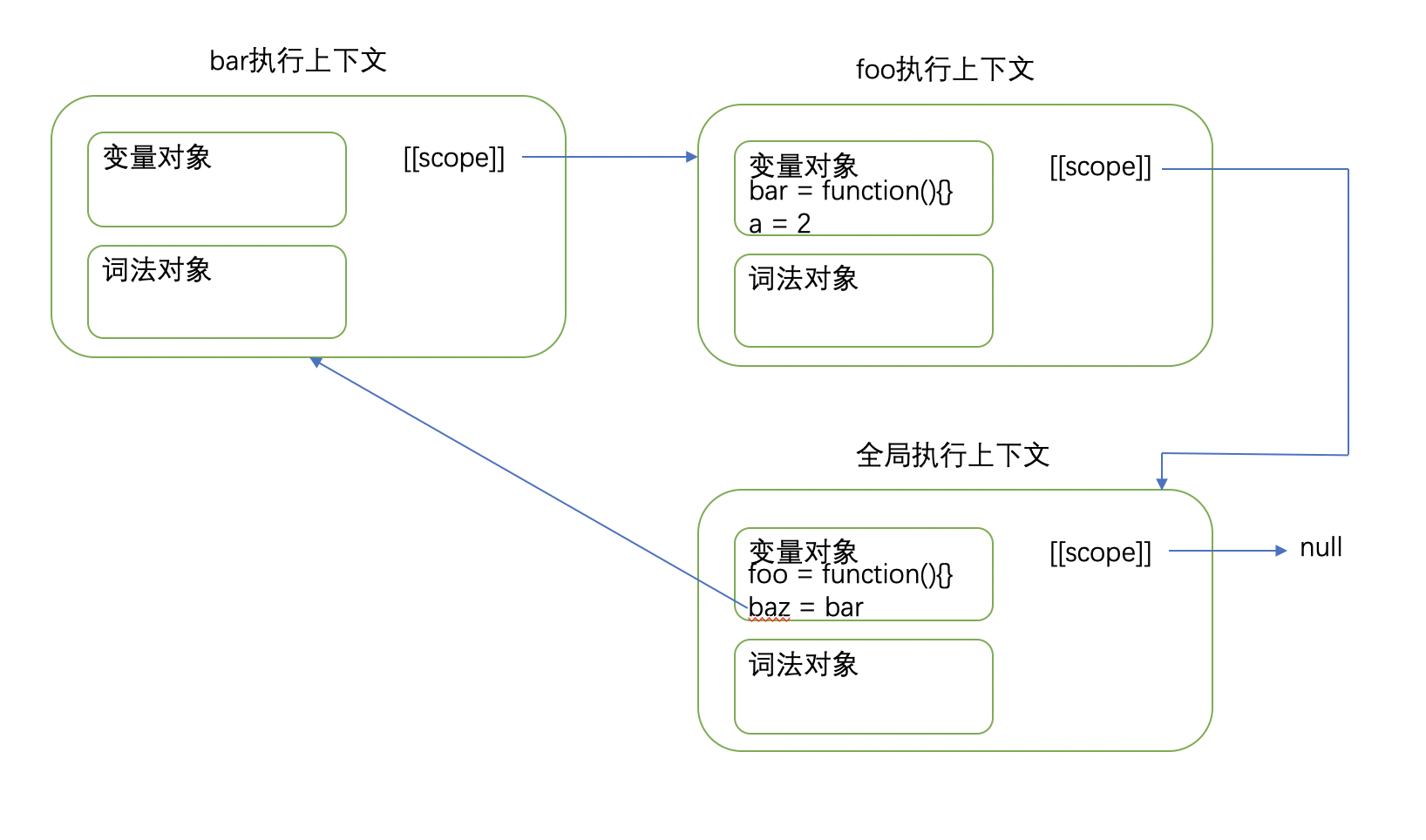baz()的调用创建了一个执行上下文,当这个函数尝试访问a时,JavaScript引擎无法在当前作用域找到它时,于是就会在其父作用域foo()中查找。