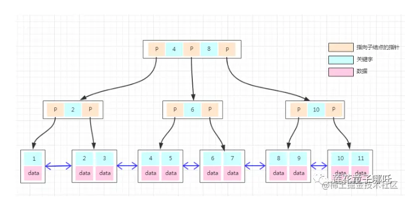 B+Tree自然保持了B-Tree的矮胖特征,但它还做了升级的处理。就是让叶子节点保存数据,而非叶子节点保存关键字即可,并且会有指针指向下一个叶子节点。这样的好处是为了提高范围查找的效率。找到数据后直接根据指针向后读取即可,而B-Tree就不行,当它读取下一个数据,还需要再一次的进行索引树的查找。