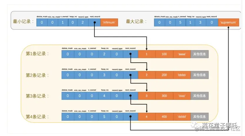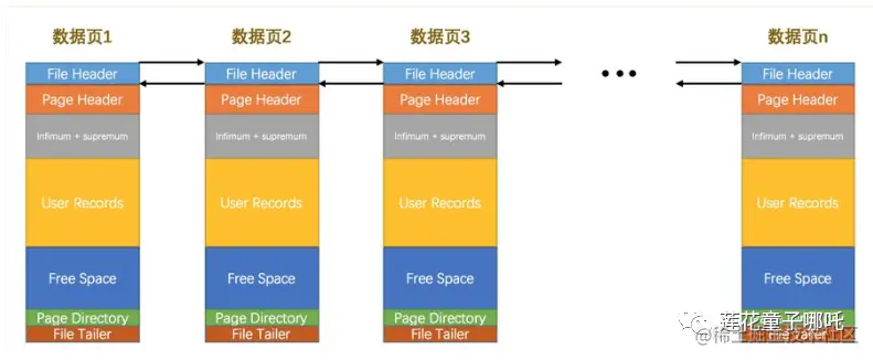 每个数据页中的数据,采用单向链表的形式进行连接。