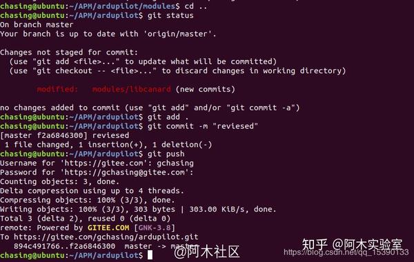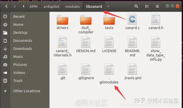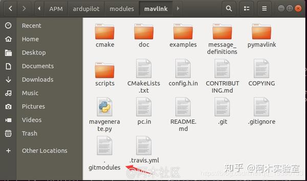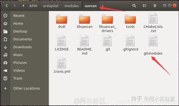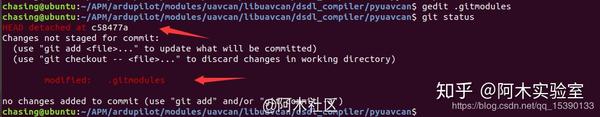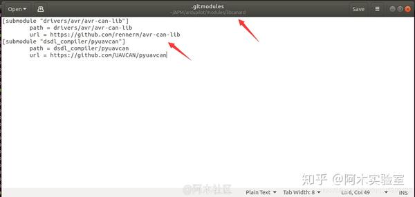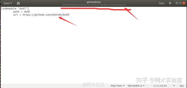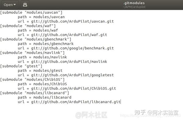 但是 APM 的代码还没有结束,此时下载下来的代码由于缺少子模块还不能正常编译 upload。正常情况下我们还需要执行 git submodule update --init --recursive 进行子模块的更新。但是这部分更新仍然走 github,速度更是慢的出奇。因此我们继续深挖,势必将速度提升到最大。根据文末的补充知识可知,子模块放在 .gitmodules 中,如下图所示 gedit .gitmodules