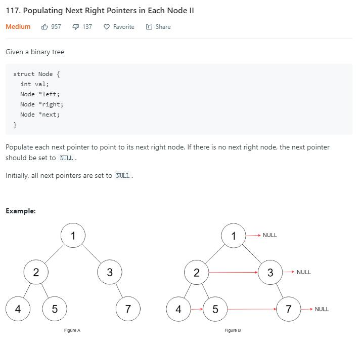给定一个二叉树,然后每个节点有一个 next 指针,将它指向它右边的节点。和 116 题 基本一样,区别在于之前是满二叉树。