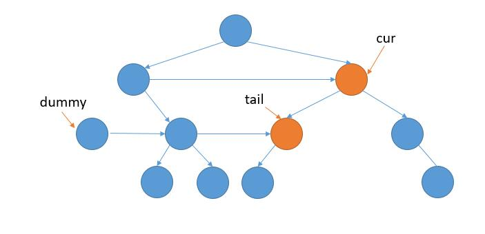 如果 cur 的孩子不为 null 就将它接到 tail 后边,然后更新tail。