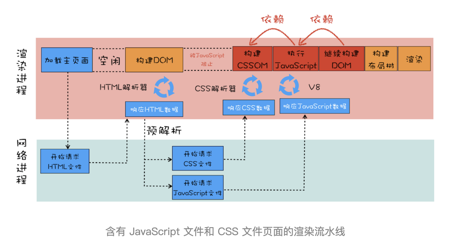 首次解析HTML时渲染进程会开启一个预解析线程,遇到HTML文档中内嵌的JavaScript和CSS外部引用就会同步提前下载这些文件,下载时间以最后下载完的文件为准。