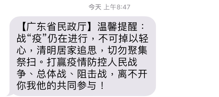 以前清明节的相关短信,无非是提醒扫墓小心山火,文明祭祀,今年则是劝大家”居家追思,切勿聚集“。