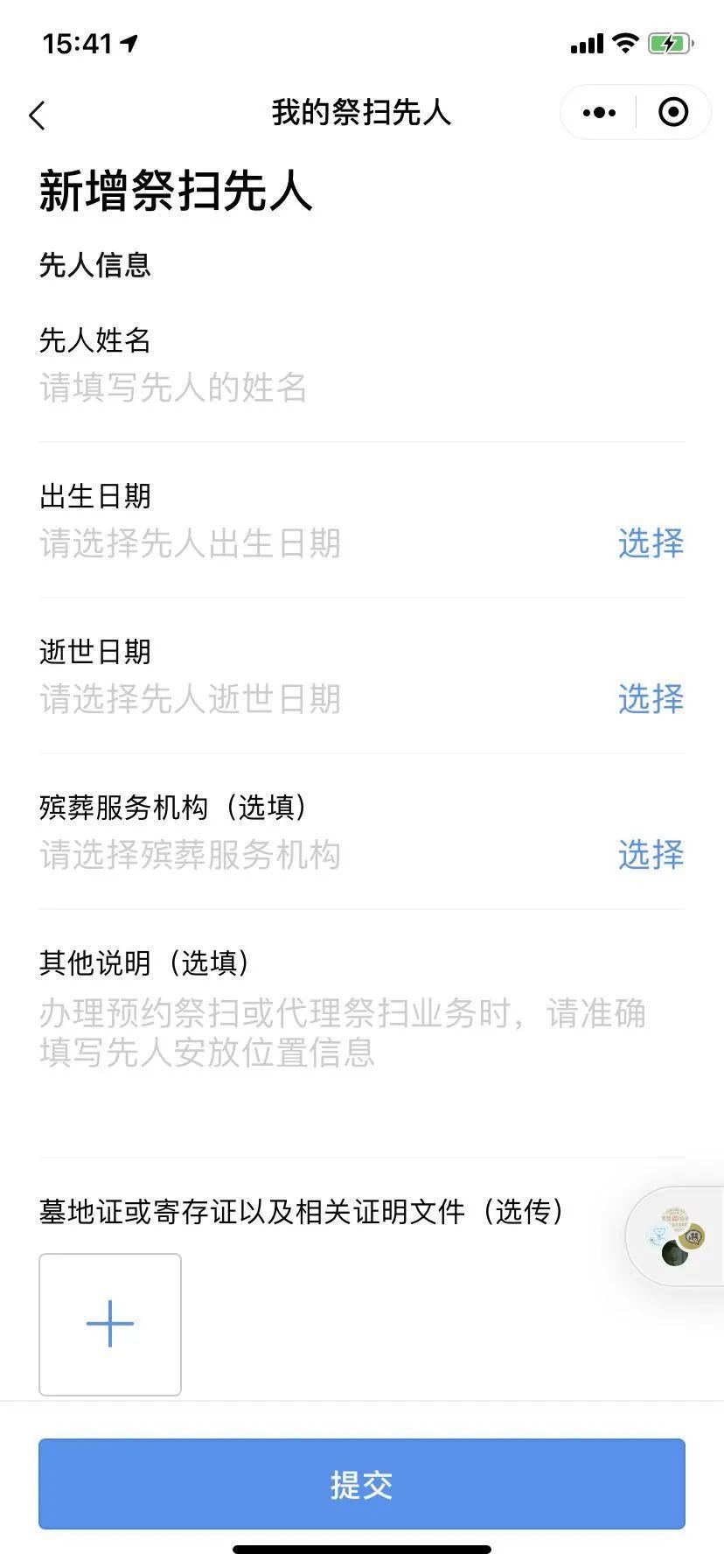 在粤省事的云祭扫服务里,你可以创建一个先人纪念空间,只需要填写相关名字和日期即可。