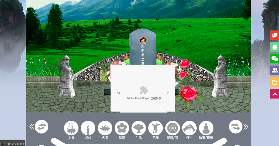 虽然网页制作有点粗制滥造,看着像上个世纪的产物,但是回头想想也是蛮环保的,一键就能上香、点烛、献花,还有各式各样的供品。