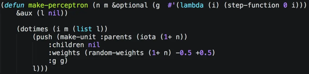 用 Lisp 编码创建有 n 个输入 m 个单元的一层感知机。