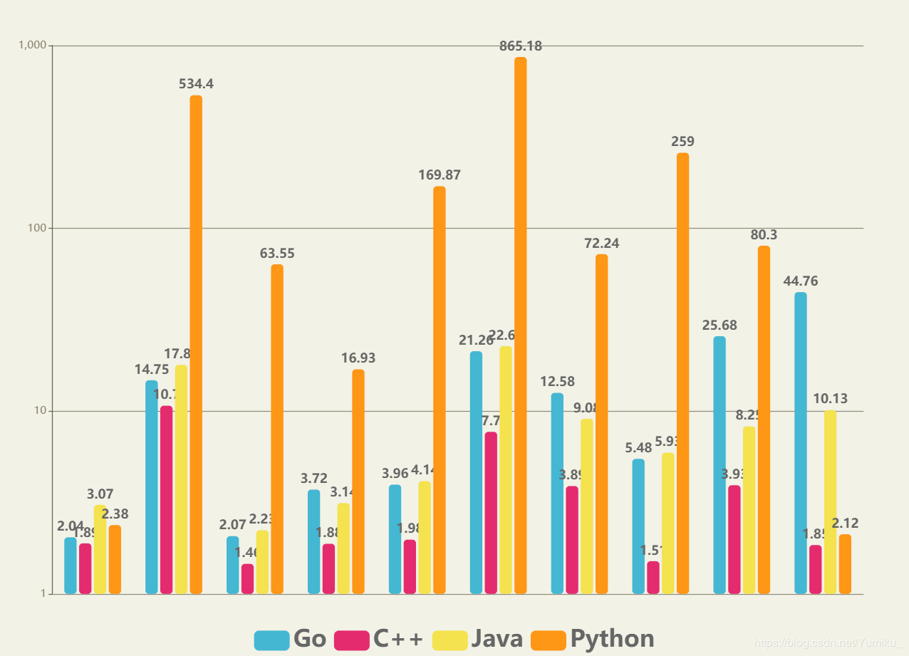 - Go和Java在算法的时间开销上难分伯仲,但在内存的开销上Java就要高得多了;
