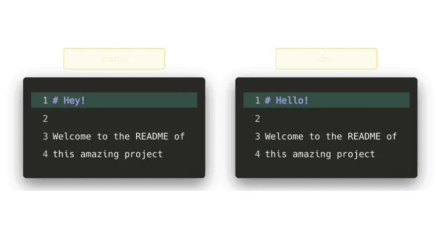 如果把dev合并到master,会导致合并冲突:你是要 Hello!呢,还是要 Hey!?