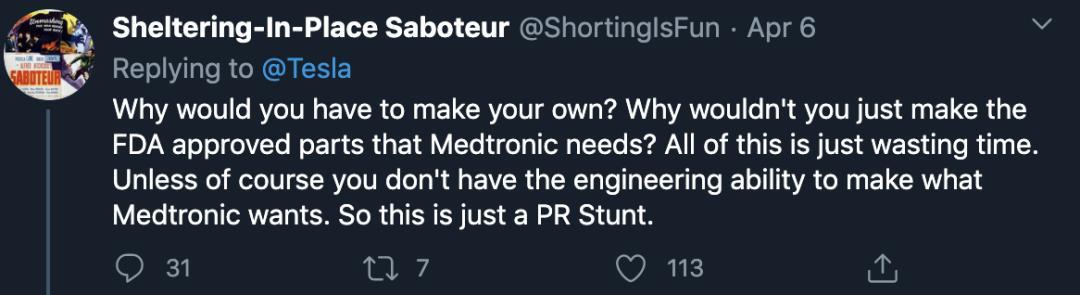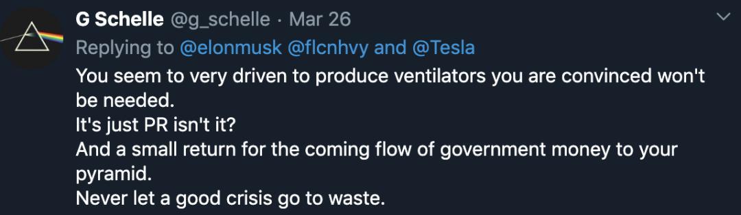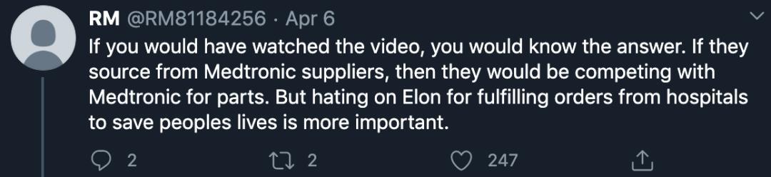 因为此前,就有人质疑特斯拉造呼吸机完全是公关表演,并责备特斯拉此举会挤占专业呼吸机生产商的零件供应。