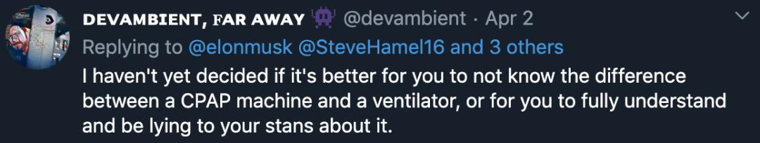 而马斯克捐赠的一批呼吸机,被指其实是CPAP(持续气道正压装置),更是引发广泛批评,甚至有人直指马斯克是在故意说谎。