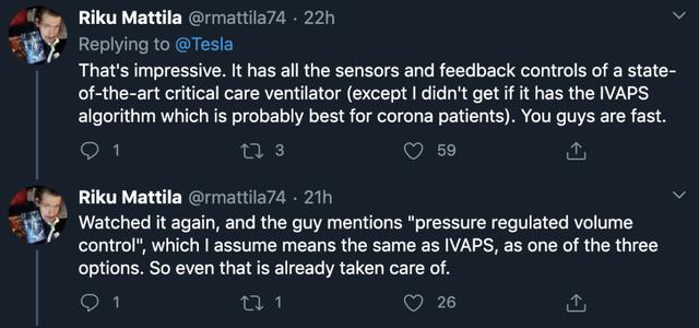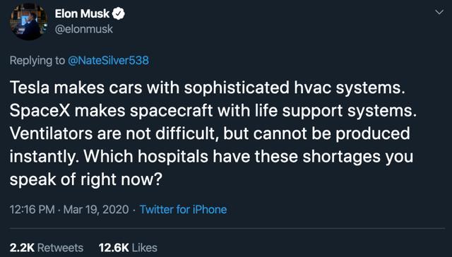 在3月19日的一则推特中,马斯克首次表达了这个想法。他关注到疫情中的呼吸机的短缺,放话说,如果特斯拉要造呼吸机并不是一件难事: