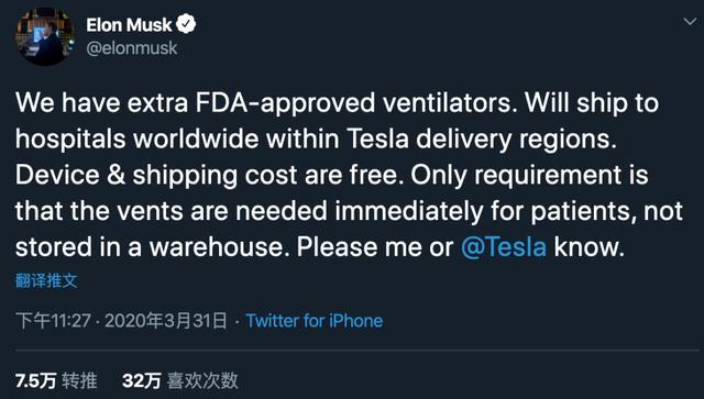 只是没想到,31日,马斯克再次捐赠呼吸机: