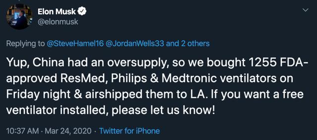 而且“特斯拉呼吸机”始末,可以说也是马斯克的又一代表作: