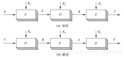 解密后,明文为: P = DK1 [DK2 (C)] {注:解密时,以相反顺序使用两个密钥}