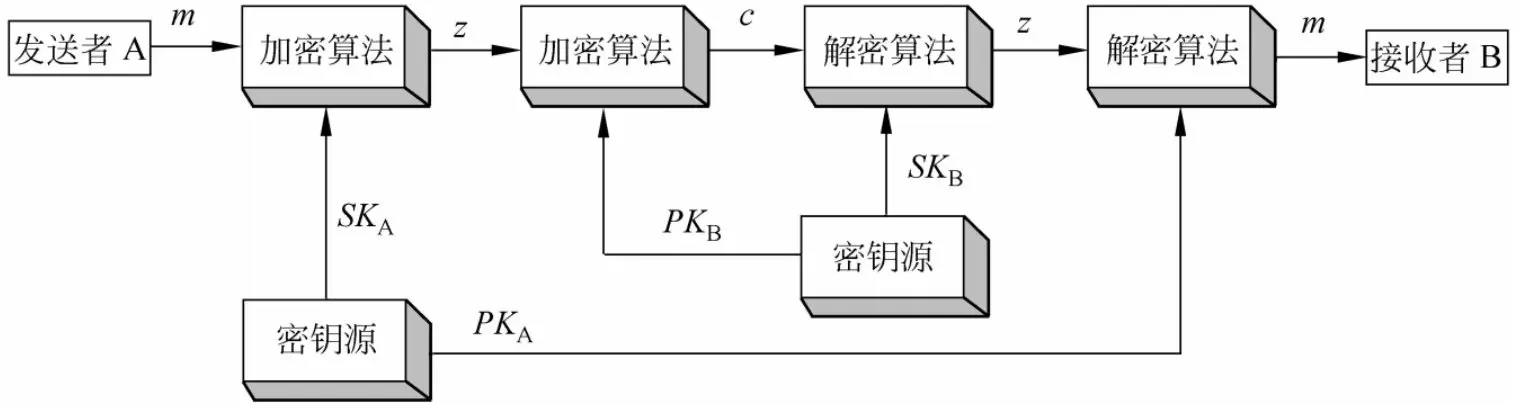 户 A 用自己的秘密钥 SKA对 m 加密,表示为 c = ESKA [ m]