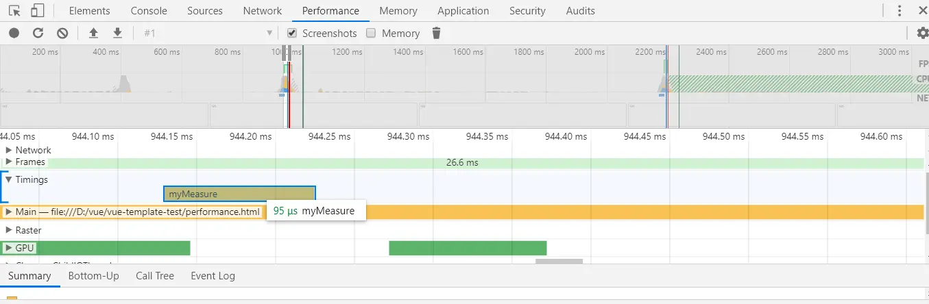 另外使用浏览器控制台做性能分析时可以看到measure类型实体部分,如下图所示:
