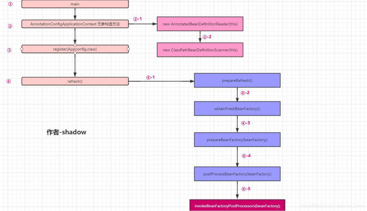 ④步,④-1到④-4以后分析,④-5便是我们上篇文章说的执行spring当中的bean工厂后置处理器,也是本文重点讨论的;下图是对上述文字的一个说明——spring容器启动的执行顺序
