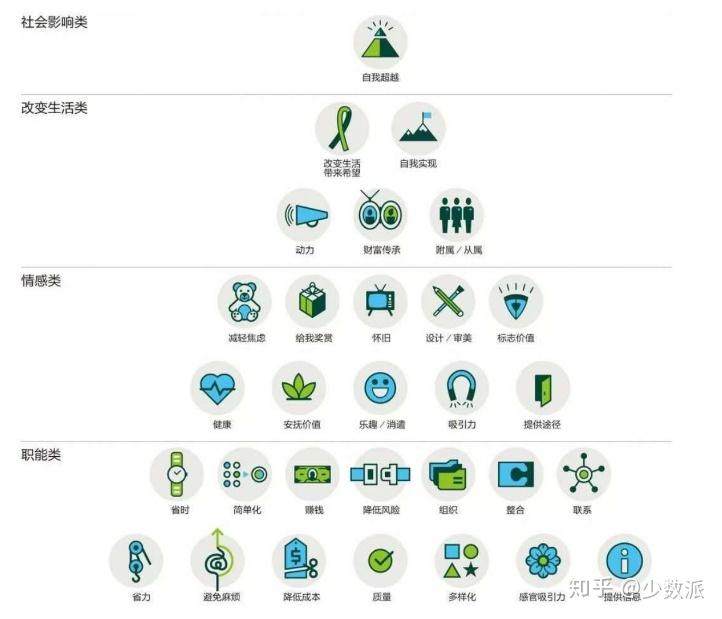 对于消费者真正在乎什么?美国知名的战略咨询公司贝恩曾提出过「B2C 价值要素金字塔」,其中涵盖了 30 种要素并划分四大类:职能类、情感类、改变生活类和社会影响类;研究显示,具备的要素越多,NPS((Net Promoter Score,净推荐值)和收入增幅就越高。