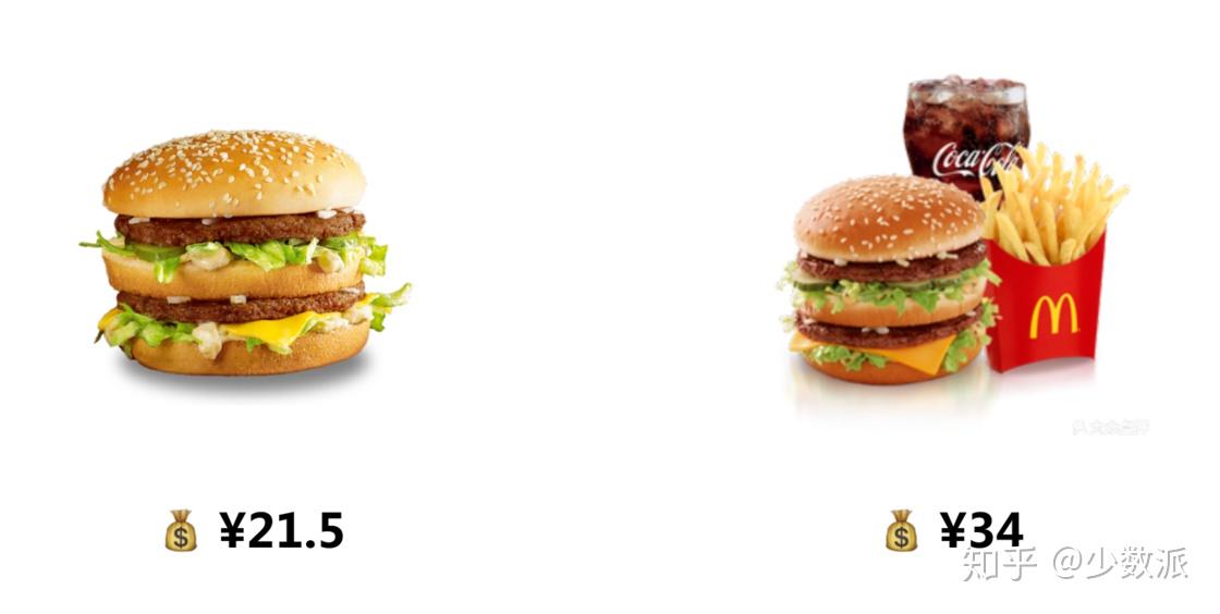 价格策略的运用,其实在生活随处可见,我们熟知的餐饮品牌麦当劳就很早将其用于门店之中,比如说:巨无霸汉堡单独售卖 21.5 元,巨无霸汉堡套餐 34 元(包含巨无霸汉堡、中份薯条、中杯可口可乐)。
