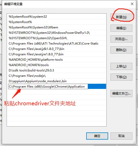进入Path界面之后,点击新建,将之前下载的chromedriver文件夹地址复制到文本框中。