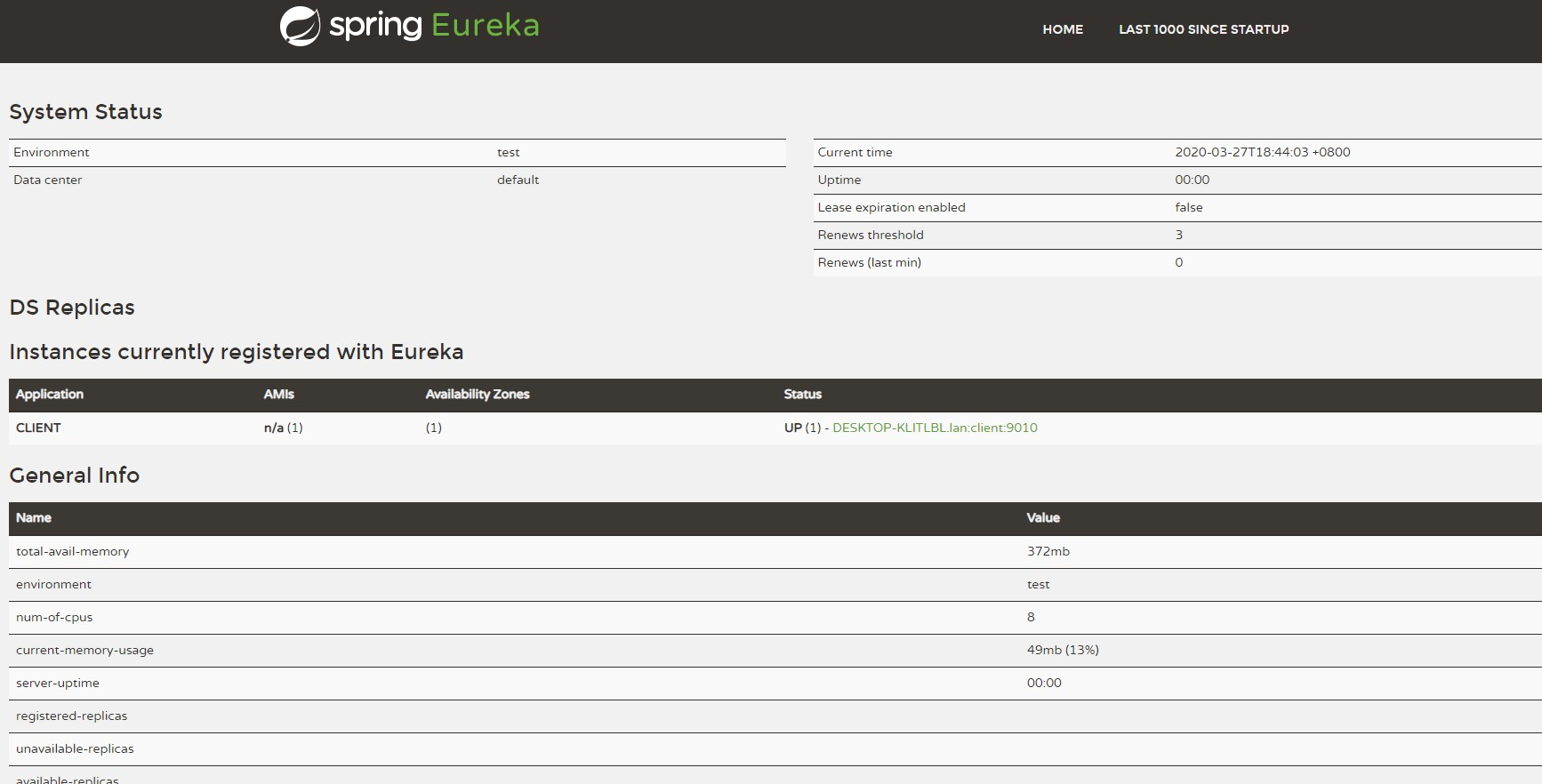 EurekaServer服务和Client服务启动之后,打开浏览器,访问 http://localhost:9090 ,即可打开Eureka服务注册中心,查看已经注册的服务